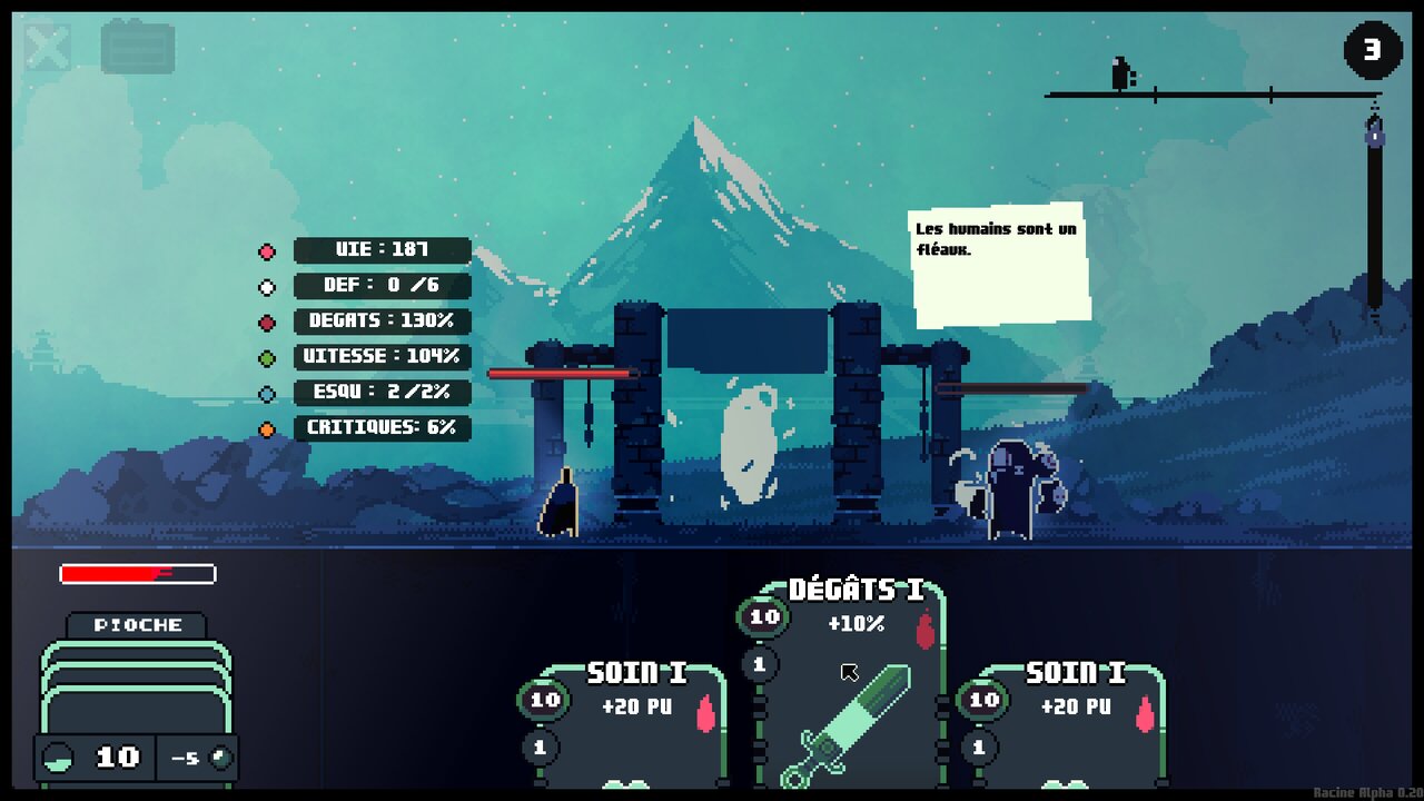 - Racine, des studios Dark Root Gardeners, s'implante près de terres japonisantes. Plus particulièrement, il se mêle au monde des samouraï. Des vagues d'esprits mécontents se mettront sur notre chemin. C'est à l'aide d'une intelligente composition de cartes en main que l'on aura la possibilité de les affronter. Chaque carte est un coup, un bonus, une esquive, ou une parade. Il faudra les jouer avec une certaine vivacité, car les esprits n'attendront pas pour asséner leurs attaques. La narration s'articule autour de quatre mondes qui, selon leurs éléments (eau, feu, air, terre) ont des défis et des mécaniques différentes. Cette épopée en deck-building (construction de paquets de cartes) et pixel art sera disponible sur PC prochainement.