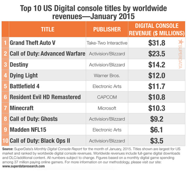 D’après une étude de superdataresearch.com réalisée sur le mois de Janvier 2015, on apprend que celles-ci ont généré plus de 133 millions de dollars de chiffre d'affaire comprenant la vente de jeux vidéos, les DLC, mais aussi en tenant compte des micro transactions parfois intégrées directement aux jeux eux-même.