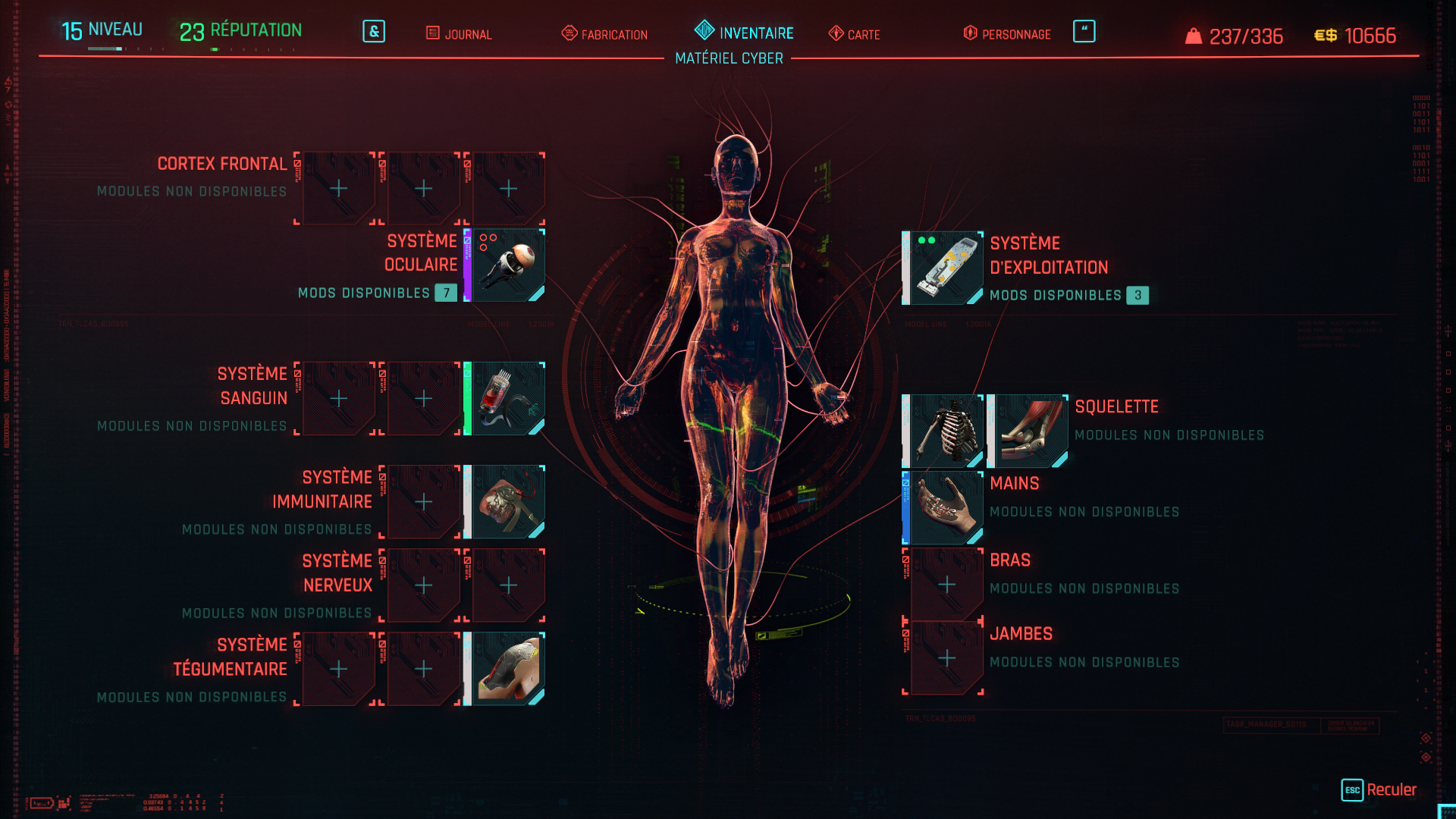 Les cyberware ont une grande importance dans Cyberpunk 2077. En allant voir un charcudoc et en dépensant de nombreux eddies, vous pourrez acheter, ou changer si vous en avez déjà, des implants cybernétiques. Chaque charcudoc a un stock différent et ces implants vous permettront d’augmenter considérablement vos capacités. Meilleure capacité d’analyse, récupérer des unités de mémoire vive en éliminant un adversaire, des lames dans vos bras, augmenter vos résistances ou la hauteur de vos sauts... Faire la liste des possibilités serait bien trop long. N’hésitez pas à installer les meilleurs cyberware dans votre corps si vous en avez les eddies et la réputation nécessaire pour être le meilleur mercenaire de Night City.
