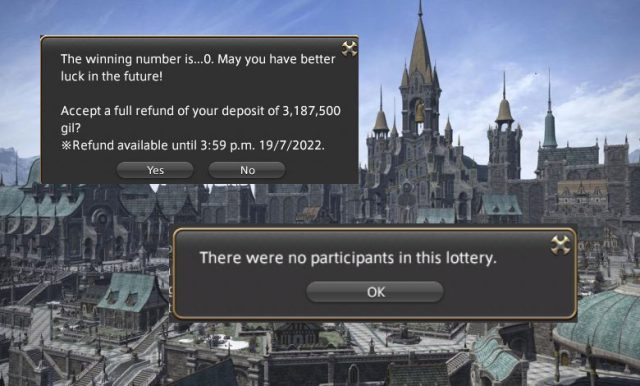 Yoshida a bien précisé que, même si les résultats affichent un 0, le gagnant est tout de même stocké dans la mémoire des serveurs. Basiquement, la personne supposée gagner, même si elle a récupéré son argent, pourra aller récupérer son dû au moment du rétablissement. La méthode exacte n’est néanmoins pas encore décidée. Conservez donc bien vos gils, il sera demandé de payer au moment de l'obtention de la parcelle. Enfin, une maintenance sera mise en place quand tout sera prêt, la date n'est pas encore fixée.