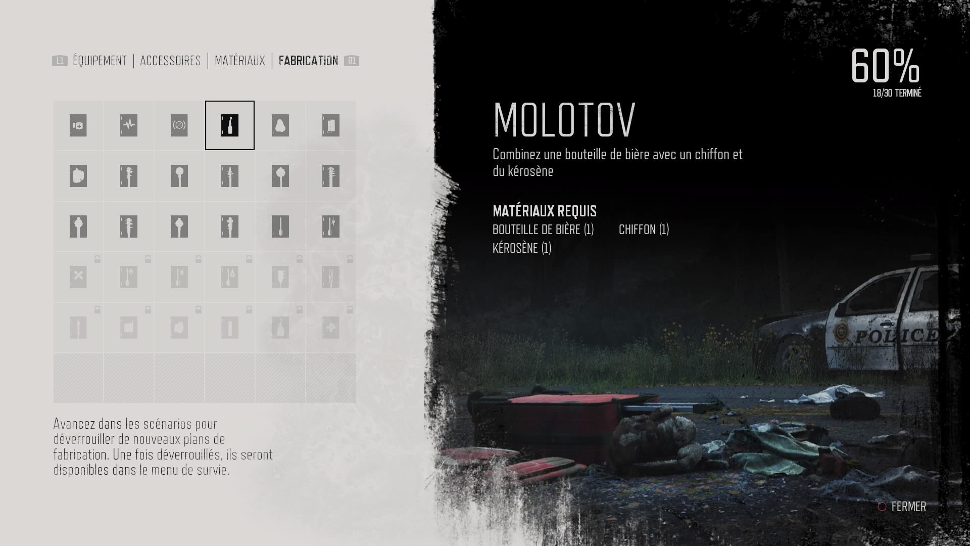 Pour prendre l’exemple d’un des objets les plus utiles, le cocktail Molotov vous nécessitera une bouteille, du tissu et du kérosène. Une fois un exemplaire de chaque en votre possession, suivez les instructions précédentes et vous pourrez joyeusement enflammer quelques ennemis.