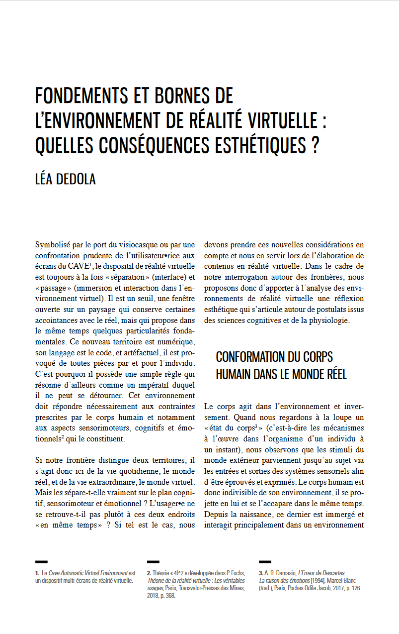 Léa Dedola est doctorante-chercheuse au sein de l'Université Lyon 2 où elle mène une thèse sur la création artistique en Réalité virtuelle. Pour en arriver là, elle est passée par le Québec, des études de cinéma, une immersion dans des studios de jeu vidéo et a récemment collaboré avec Katia Morel, artiste et généraliste 3D, pour une résidence croisée entre le Stereolux (à Nantes) et le Laval Virtual Center. Léa Dedola fait de l'immersion et des interactions émotionnelles en réalité virtuelle ses spécialités. Avec une technologie en pleine expansion entre les mains, elle participe à sa construction et espère modeler l'esthétique de ces environnements, pour une valorisation de l'individu.