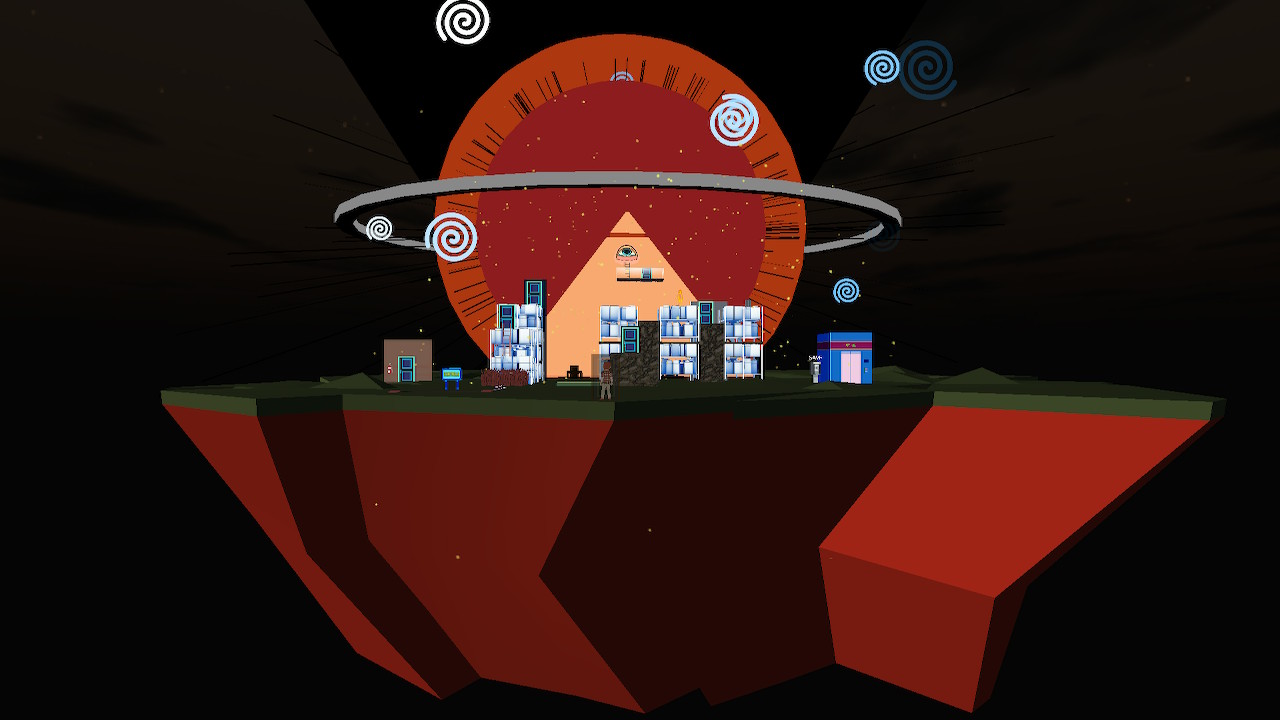 En entrant dans les lieux, Alex se retrouve dans un monde onirique où la logique perd sens. Là où devraient se trouver des salles de machinerie se trouvent une successions de lieux étranges. L’un de ceux-ci se compose une île volante surmontée du pyramide portant un œil unique tel le symbole des illuminatis. Pour en sortir il faut à notre héros réactiver l'électricité de la cage d’ascenseur qui semble un peu perdue en ce lieu absurde. Pour ce faire il lui doit monter sur des étagères afin d’atteindre une porte qui l'amène sur la dite pyramide afin de mettre son doigt dans l’œil. Ce dernier pleure et le torrent d’eau active des turbines électriques connectées à l’ascenseur.