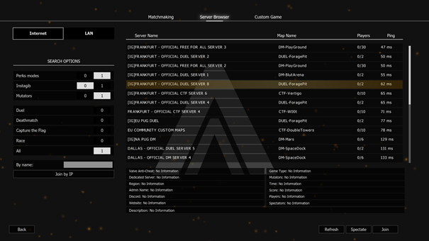Faute à un manque de popularité, il y a vraiment très très peu de monde en ligne. Ephrem et moi n'avons croisé que 4 personnes connectées et nous n'avons même pas pu jouer avec eux. Nous avons été amené à affronter uniquement des bots. Ces IA sont d'ailleurs invincibles en instagib. Ces derniers peuvent spawn kill, ont des yeux derrière la tête... bref jouer contre 30 bots en instagib est un enfer. Par contre, dans les autres modes, ils sont presque statiques et deviennent très faciles à éliminer. Ces bots sont devenus un mystère pour nous ! Peut-être s'agit-il d'un problème d'IA et plus précisément de pathfinding sur certaines maps ?
