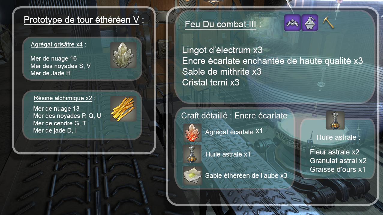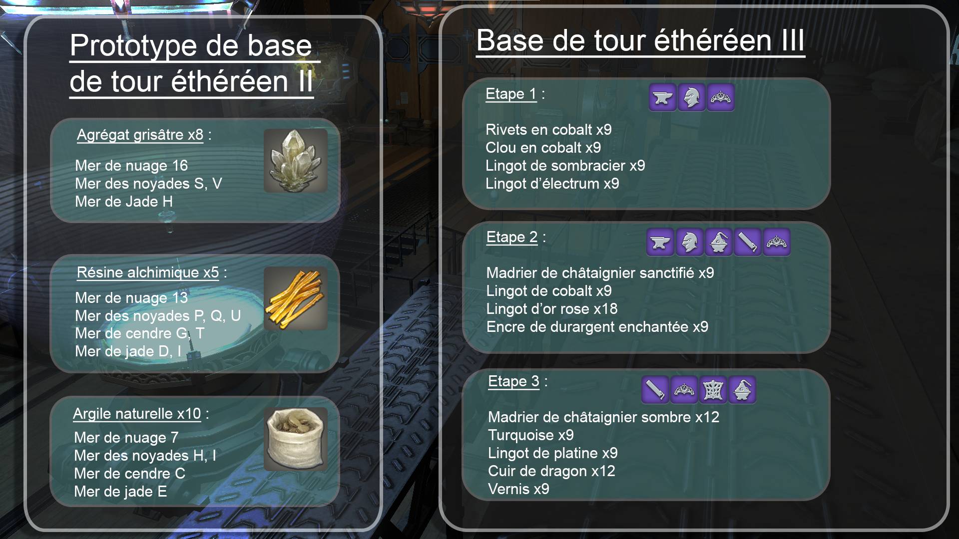 La première étape consiste à fabriquer une base de tour éthéréen qui servira à rendre le bienfait fonctionnel. Le minimum requis est la base de tour III. Dans un premier temps, rendez-vous dans l’atelier de compagnie libre. Sur la gauche se situe le tableau des prototypes. N’importe lequel à partir du II fonctionne, ici nous prendrons ce dernier en exemple. Pour débloquer le prototype, il faudra fournir des matériaux obtenus grâce aux expéditions d’aéronefs et sous-marin. Sont requis : 8 Agrégats grisâtres, 5 Résines alchimiques, 10 Argiles naturelles. Ces trois matériaux s’obtiennent dans des zones d’expéditions précisées sur le schéma ci-dessous :Étape 1 :