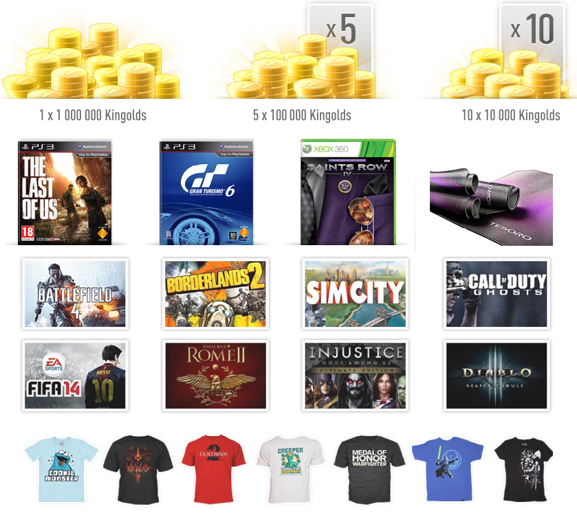 Si vous êtes parmi les 2 premières miss Kinguin vous pourrez gagner ceci : Miss Kinguin 2014 : De gauche à droite : Chaise de bureau DXRacer, casque Tesoro Kuvén Angel, 400€ en liquide, GTA V sur PS3 ou Xbox One & Thief sur PS4, PS3 ou Xbox360, un T-shirt femme level 77. lot miss Kinguin image Vice miss Kinguin 2014 : De gauche à droite : Coupon de réduction de 50% pour une DXRacer chair, souris Tesoro Gungnir H5, 100€ en liquide, Tomb Raider Définitive édition sur PS4 ou Xbox One, un T-shirt femme level 77. Lot vice miss Kinguin image Il y a aussi les lots suivant qui seront donnés par tirage au sort pour les autres participantes ainsi que les votants du concours : - 1 x 1 000 000 de Kingolds (1000€ de valeur sur le site Kinguin.net), 5 x 100 000 Kingolds (100€ de valeur sur le site Kinguin.net), 5 x 10 000 Kingolds (100€ de valeur sur le site Kinguin.net), 2 jeux Last of Us sur PS3, 2 jeux Grand Turismo 6 sur PS3, 3 jeux Saints Row 4 Commander chef édition sur Xbox360, 3 tapis de souris Aegis, 10 jeux Battlefield 4, 10 jeux Borderlands 2, 20 jeux Sim city, 10 jeux Call of Duty Ghosts, 5 jeux Fifa 2014, 15 jeux Total War Rome 2, 10 jeux Injustice Gods Among Us, 5 jeux Diablo 3 Reaper of Souls, différents t-shirts de femmes de level 77. Autres lots Kinguin.net image Tout ces lots sont offert par Kinguin.net et les sponsors du concours : DXRacer, Tesoro, 2game.com, Level 77. Alors êtes vous prêts à participer pour tenter de remporter ces merveilleux lots ?