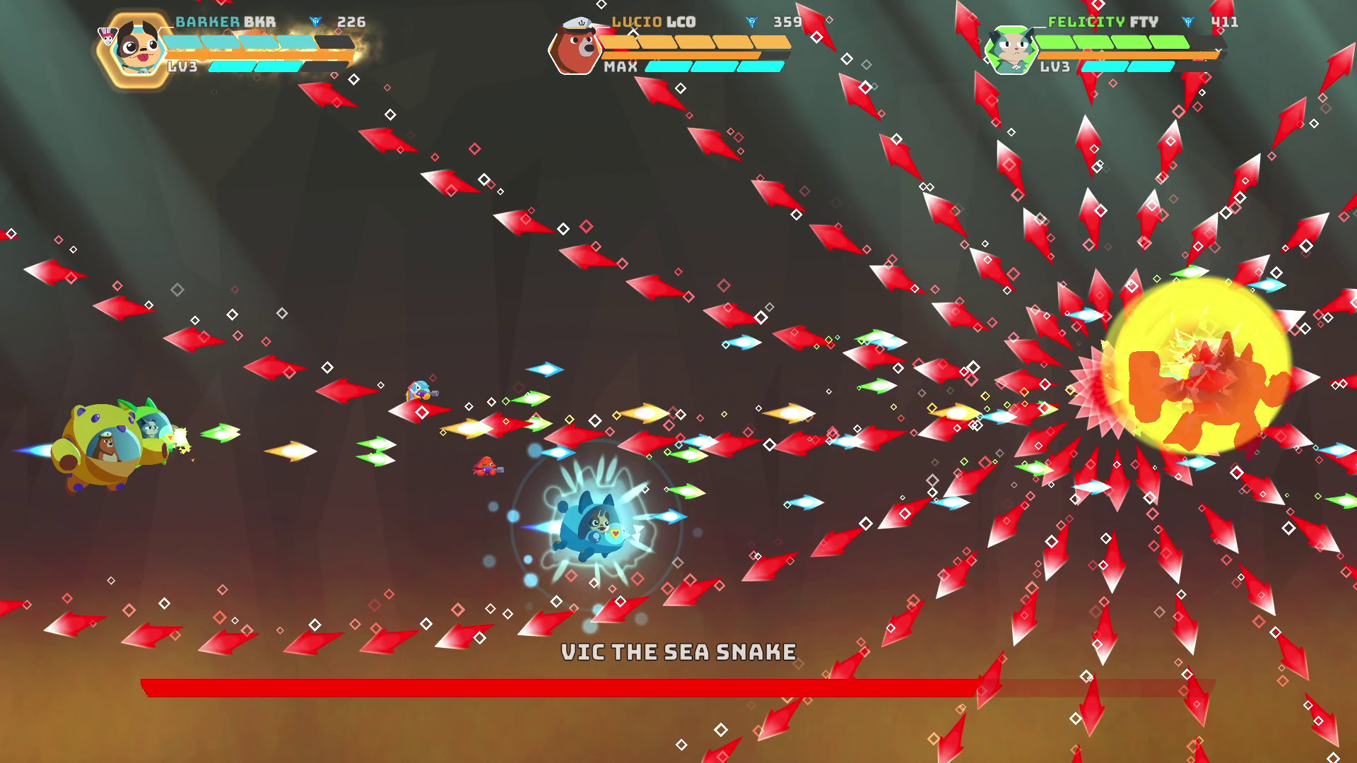 Tic Toc Games, petit studio qui se partage entre la Californie et les Philippines, fait émerger des profondeurs du rétro B.ARK. Pris dans la vaste famille des Shoot 'em up (ou shmup pour les intimes), le jeu nous place aux commandes d'une escadrille très animale composée d'un chien, un chat, un lapin et un ours, qui ont pour mission de libérer le système solaire du règne tyrannique des poissons. Le tout baigne dans une sauce très cartoonesque, rappelant leur précédente création Adventures of Pip, partageant malheureusement avec celui-ci beaucoup de lacunes.