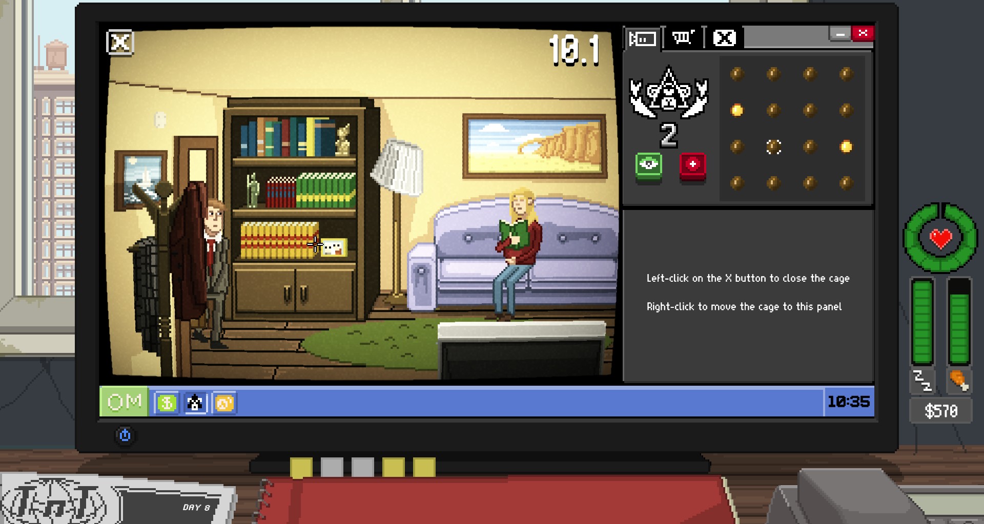 Alors que vous serez en train d’épier les nombreuses situations différentes au travers de vos caméra, il faudra faire attention à ne pas vous laisser dépérir. Car oui, toute personne a des besoins élémentaires, ici, la faim, la fatigue et votre santé. Les deux premières jauges correspondantes baisseront progressivement, dormir et manger vous feront gagner des points dans les jauges respectives. Mais ce serait trop simple ainsi, si vous mangez des choses trop grasses qui redonnent beaucoup de vie, votre santé en pâtira. Tout comme boire du café qui sera bénéfique sur votre sommeil mais également votre santé. Manger des aliments sains vous fera par contre gagner peu de satiété mais vous redonnera de la vie.