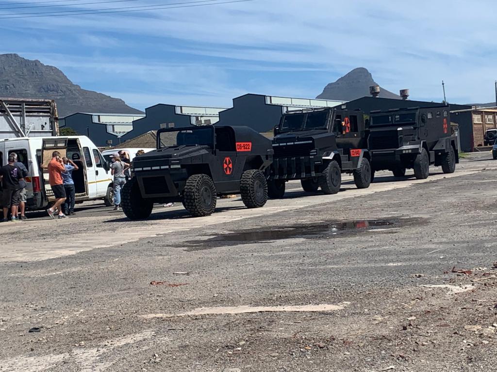 Communication discrète d'une scène de tournage de la série Resident Evil, avec apparition de voitures d'Umbrella Corporation Communication discrète d'une scène de tournage de la série Resident Evil, avec apparition de voitures d'Umbrella Corporation