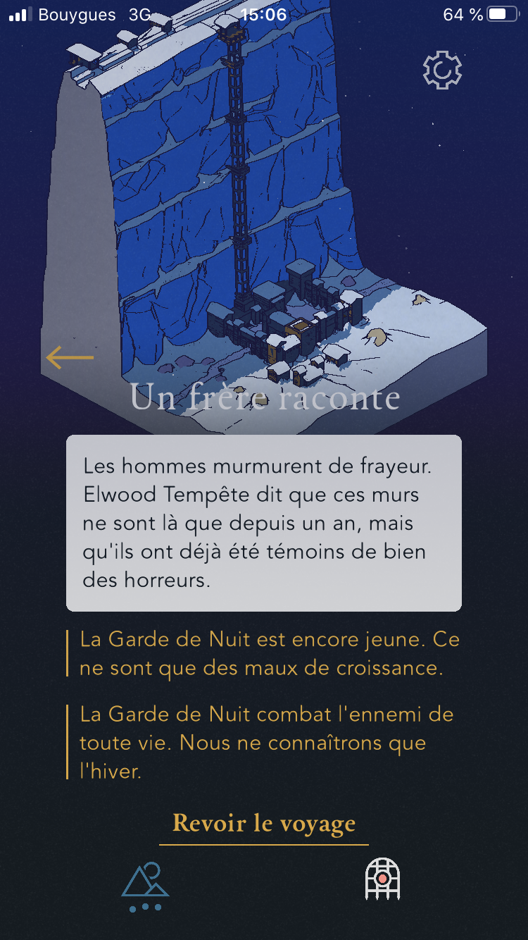 J’ai éprouvé énormément de frustrations à tester toutes les réponses possibles (puisque les mêmes missions reviennent encore et encore), afin de voir si mes réponses avaient un impact sur le quotidien des corbeaux (je ne le sais toujours pas). Tout comme je n’ai pas compris comment faire pour débloquer de nouveaux objectifs dans le Nord. J’avais sans arrêt un message me disant : « peu d’objectifs connus », très bien mais que dois-je faire pour en obtenir de nouveaux ? J'en suis venue à douter qu'il en existe vraiment. Je me suis demandée si ces tâches répétitives avaient pour but de nous montrer le quotidien dur et rébarbatif des frères de la garde de nuit mais je ne suis pas vraiment sûre. Même si les tâches sont les mêmes, les choix et mises en œuvre, elles, auraient pu varier.