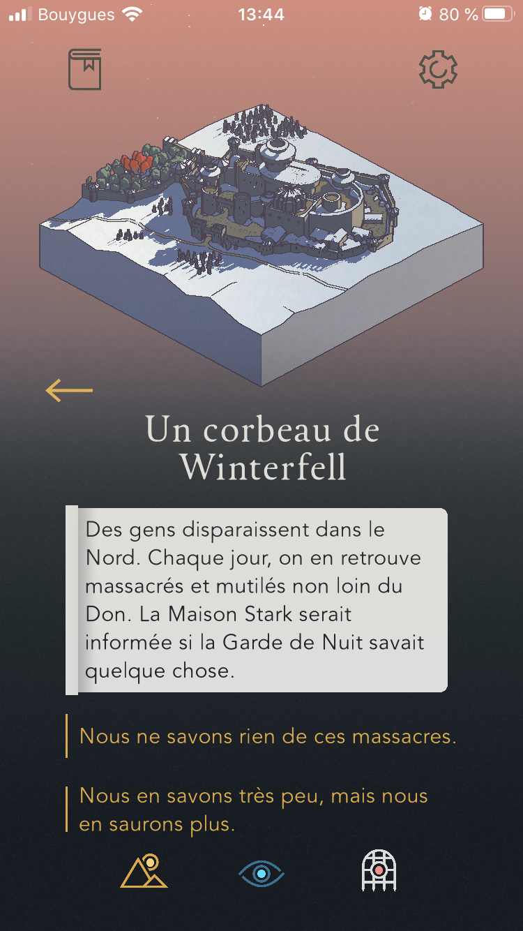 Game of Thrones : Tale of Crows est un jeu narratif incrémental, ce qui veut dire que le temps continue de se dérouler même si vous ne jouez pas. Rassurez-vous il n’arrivera jamais rien de bien méchant à vos hommes, vous n’aurez donc pas besoin de rester scotché à votre téléphone pour vérifier que vos troupes n’ont subi aucune attaque surprise de sauvageons.