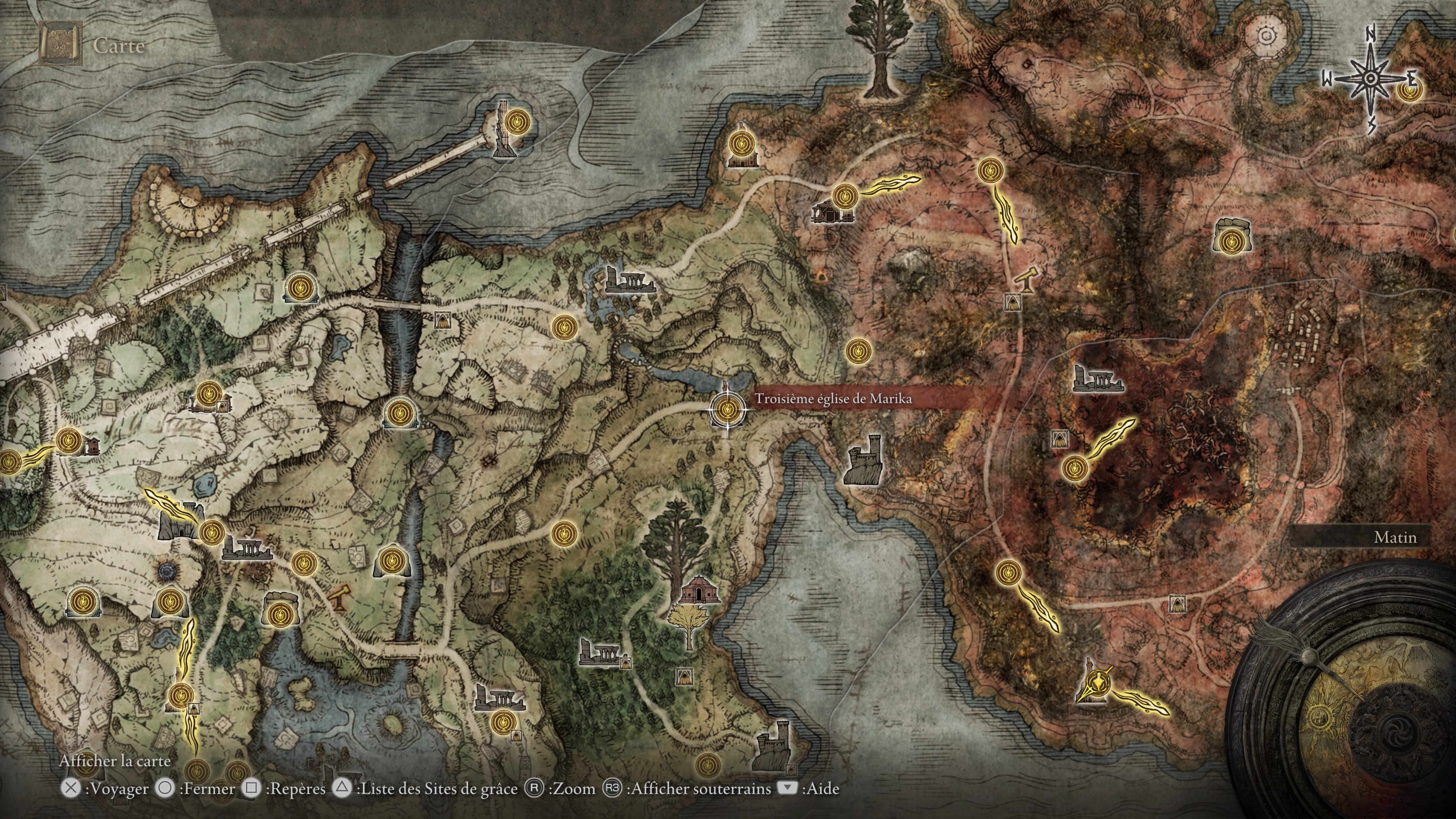 Une fois la monture récupérée, dirigiez-vous vers l'est à l'endroit indiqué par la carte pour trouver la troisième église de Marika. Une fois le site de grâce activé, dirigez-vous vers le nord-ouest à la recherche d'un téléporteur. N'ayez crainte et prenez-le !