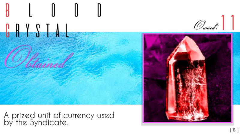 Un paiement peut être effectué à certaines bornes pour enrichir notre collection, sous la forme de cristaux de sangs. Ces cristaux sont dissimulés sur l'île et sont assez nombreux pour qu'on en déniche un tous les dix mètres. Ces objets et ces cristaux de sangs sont comme des glitchs dans cette simulation paradisiaque et prennent la forme d'amas de pixels détériorés, dégageant un bruit blanc informe. Ce qu'ils offrent va de l'objet le plus futile au plus utile, de la canette de soda à l'arme du crime, du texte divin à la petite chanson qui agrémentera notre playlist.