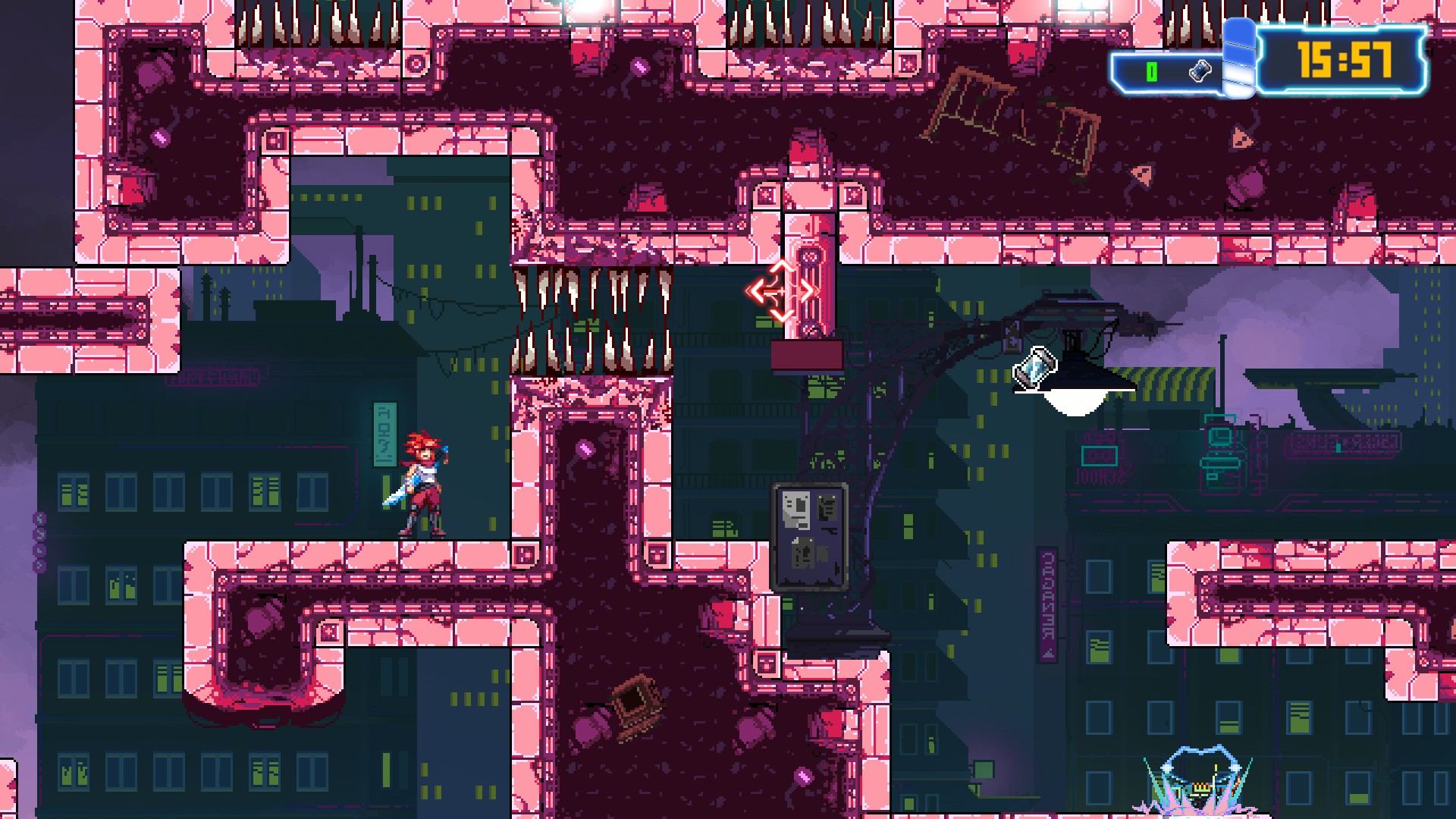 Au premier abord, Aeon Drive est un platformer assez classique. Sauter, courir, glisser, rebondir sur les murs, les éléments de base du gameplay fonctionnent bien et sont plaisants. Votre personnage possède quelques armes, à savoir un sabre qu’elle peut utiliser pour abattre ses ennemis et une dague de lancer. Une fois la dague plantée dans un mur, vous pourrez vous y téléporter. Cet outil est particulièrement utile pour passer des obstacles et atteindre des zones inaccessibles sans. Maitriser la dague est donc important pour progresser efficacement dans le jeu.