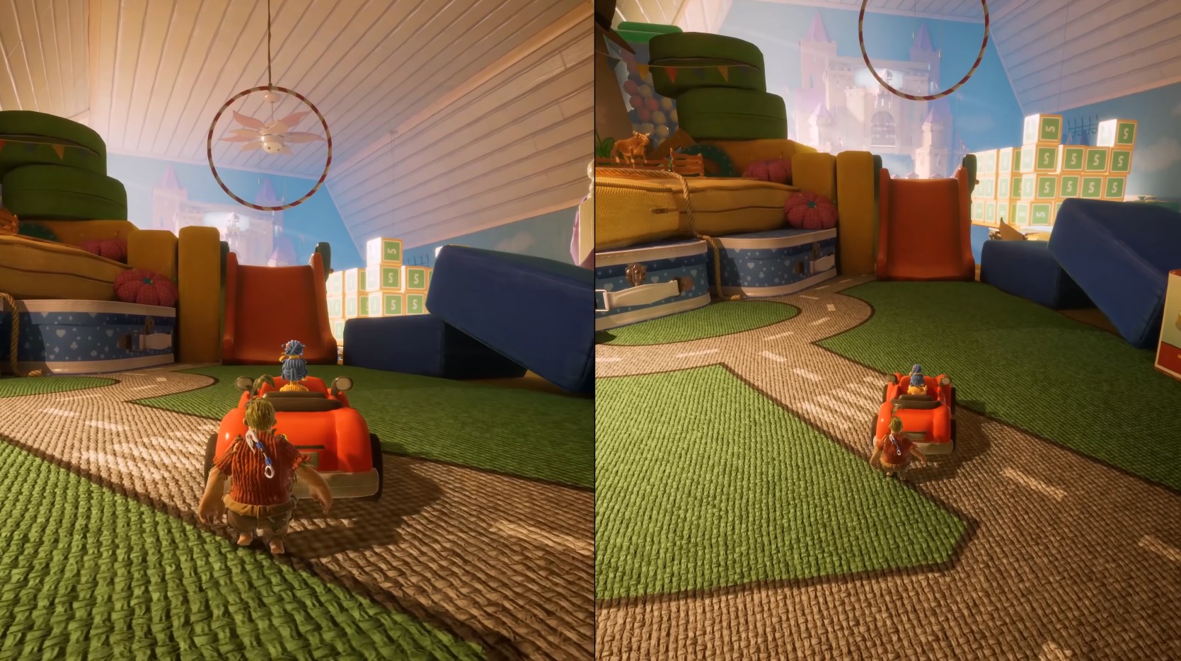 Qui n’a jamais rêvé, étant enfant, d’expérimenter cette échelle de taille minuscule qui nous ferait voyager jusqu’aux royaumes de nos caisses à jouets ? Avec huit environemental artists et neuf levels designers, le petit indé Hazelight a misé gros sur la richesse de sa mise en scène. C’est là où il frappe fort, et dans la lignée des petits mondes miniatures, on ne pouvait imaginer mieux.