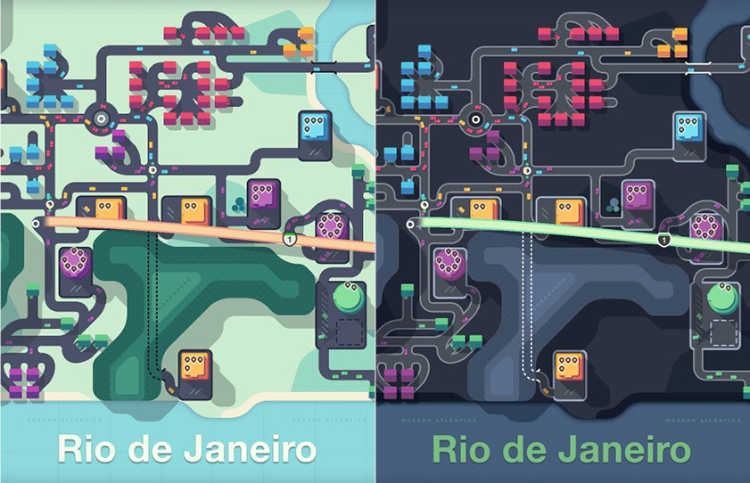 Tel un paysage danois, les maisons arboreront différentes couleurs, du rouge le plus carmin aux riches nuances de bleu, indiquant quels centres les habitants souhaitent rejoindre. Reprenant le concept de Mini Métro où chaque forme géométrique rejoignait un quai correspondant, Mini Motorways fait ici jouer des palettes de peinture, enrichissant de même un visuel déjà tout en pastels. Mais attention, il faudra garder en tête que les premières routes seront certainement les plus importantes dans l'avenir. Car les maisons et centres pullulent au fil des semaines, se multipliant en périphérie ou en centre-ville, dessinant déjà une croissance urbaine démesurée.