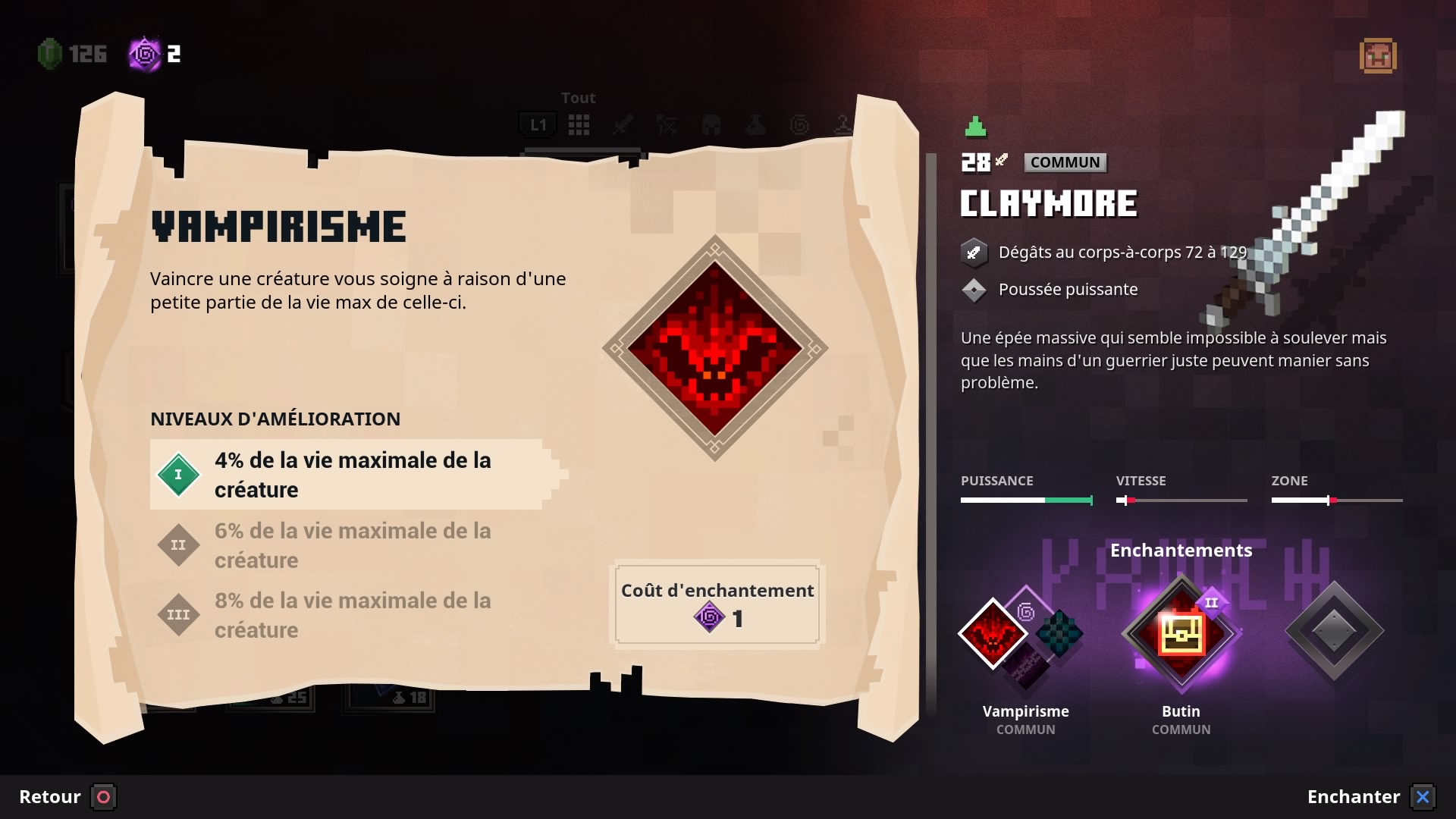 Le “leveling” est également partie prenante du gameplay et est lié à l’équipement. Chaque niveau vous donne un point d’enchantement. Chaque équipement, en dehors des artefacts, peut avoir un ou plusieurs enchantements activés, qu’il vous faut choisir parmi ceux proposés. Un enchantement coûte un point et bloque les autres enchantements de son emplacement. Améliorer au second niveau coûte deux points et au troisième trois points, le maximum.
