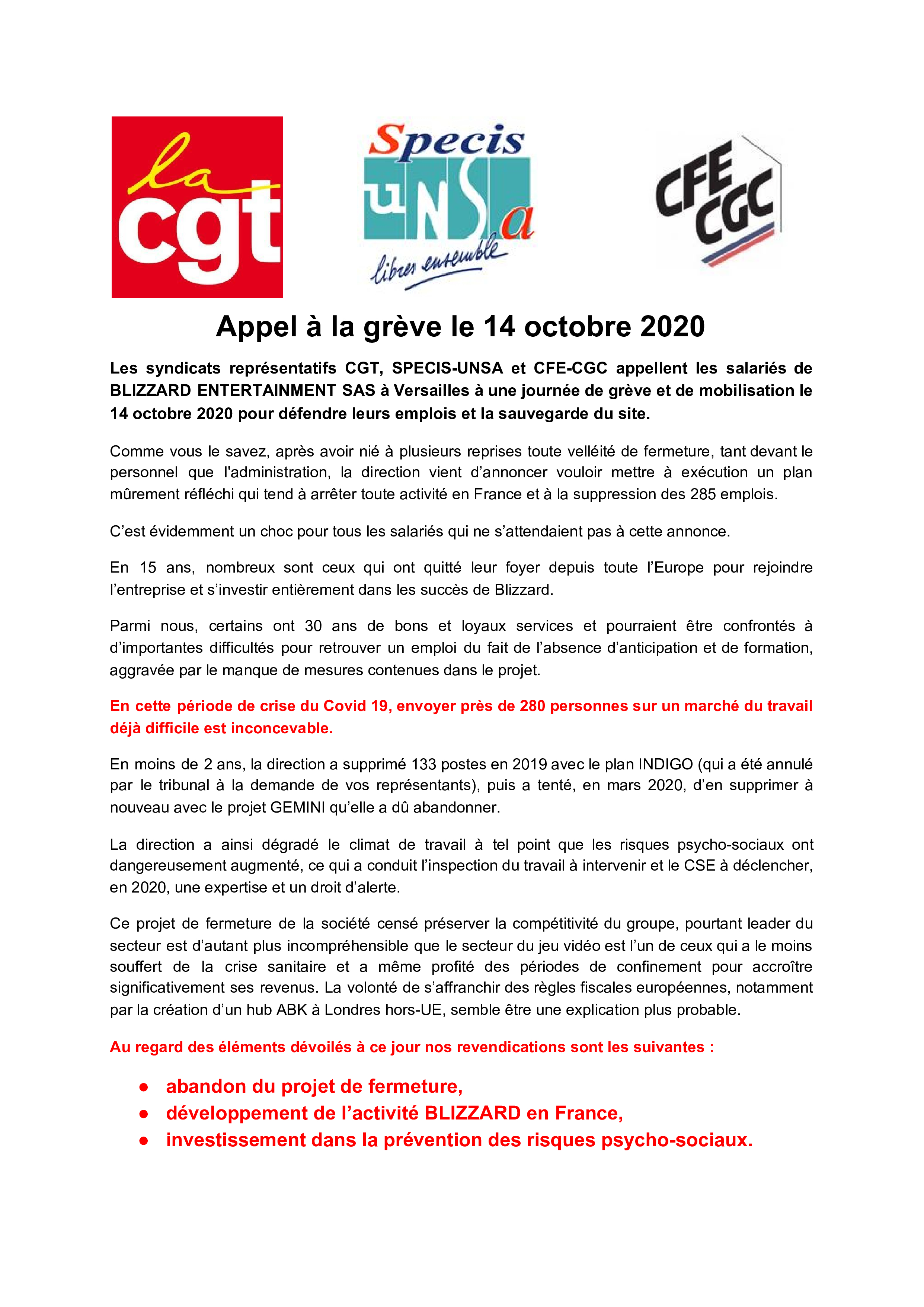 Pour rappel, le 6 octobre dernier, Activision Blizzard a annoncé officiellement la fermeture de leurs locaux versaillais, mettant au passage au chômage environ 285 personnes. Une nouvelle difficile à encaisser pour ces derniers comme vous pouvez l'imaginer. Alors que des négociations pour discuter des programmes d'aides potentiels pour les licenciés à venir ont été abordées les 13 et 14 octobre, c'est le 14 après-midi qu'a été officiellement annoncé la grève des employés et le soutien des syndicats protégeant les métiers du jeu vidéo, comme le STJV (Syndicat des Travailleurs et Travailleuses du Jeu Vidéo), via ce tweet :