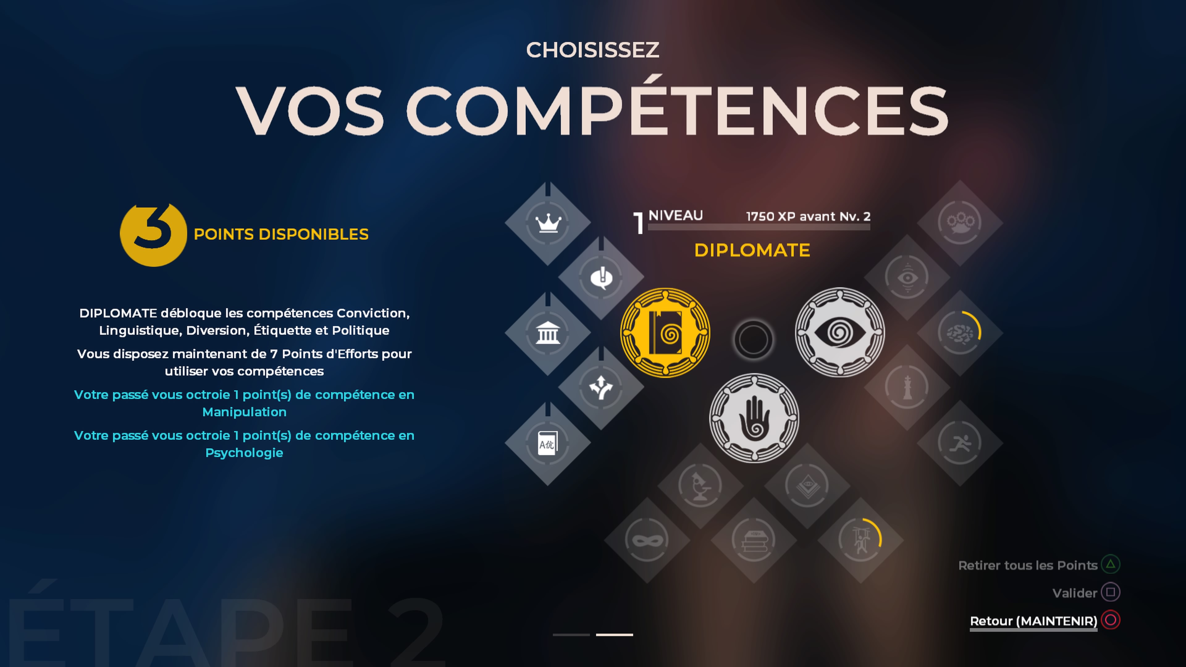 Au début du jeu, vous choisissez l’une des trois branches de compétences comme “classe” de personnage, entendre ici le métier qu’a choisi Louis avant cette aventure entre Diplomate, Occultiste ou Détective. Ce choix définit quelles compétences vous seront octroyées à l’achat entre chaque chapitre. Toutes les compétences sont nécessaires si vous souhaitez profiter pleinement du jeu.