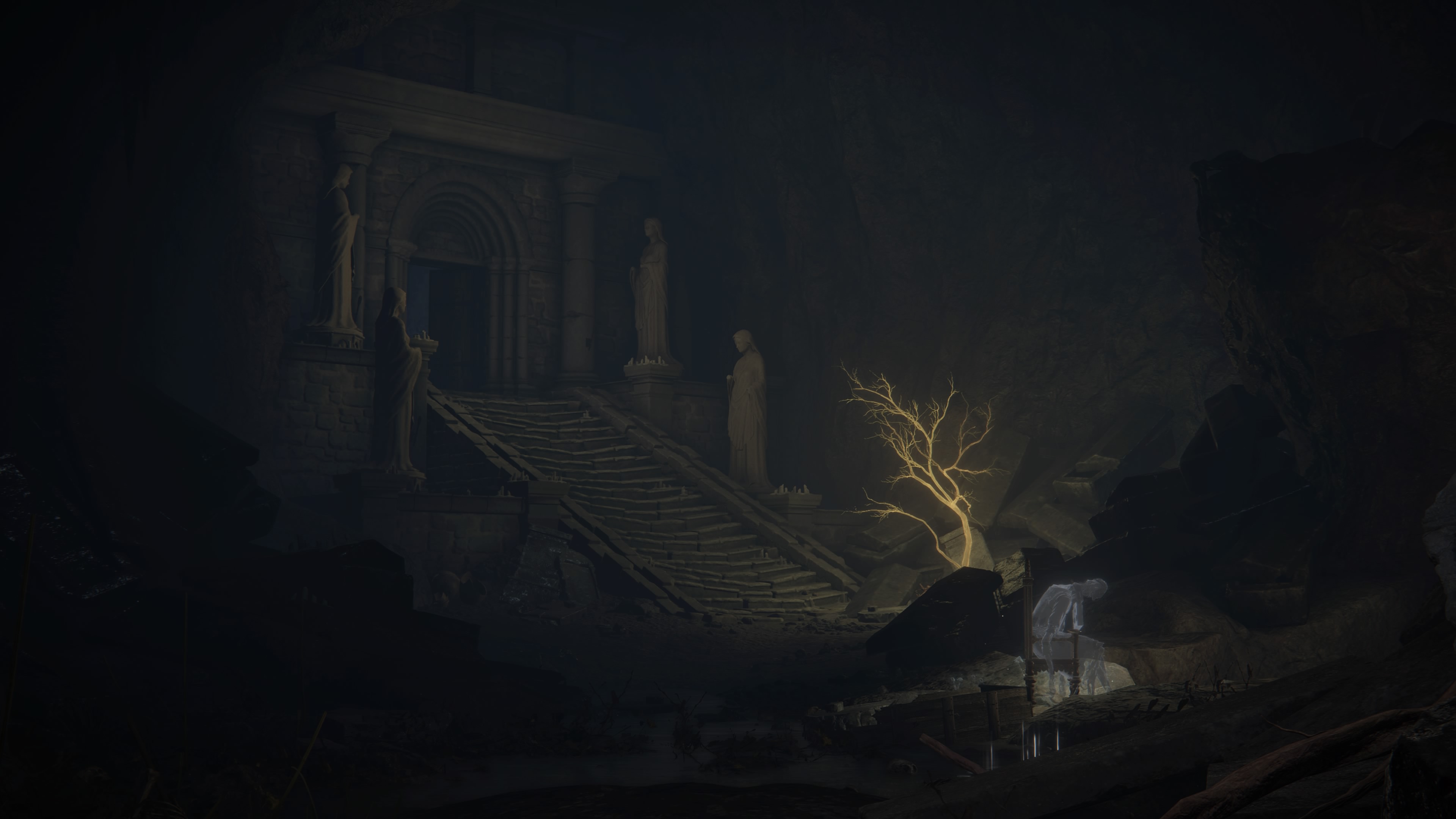 Après avoir créé son personnage, découvert la cinématique d'introduction et la zone du prologue, le joueur se retrouve dans le Cimetière Abandonné qui, une fois traversé, mène à la découverte du monde ouvert d'Elden Ring. Il est toutefois fortement conseillé de ne pas se diriger directement vers la porte, mais de se diriger vers le PNJ fantôme sur la droite qui nous indique ceci :