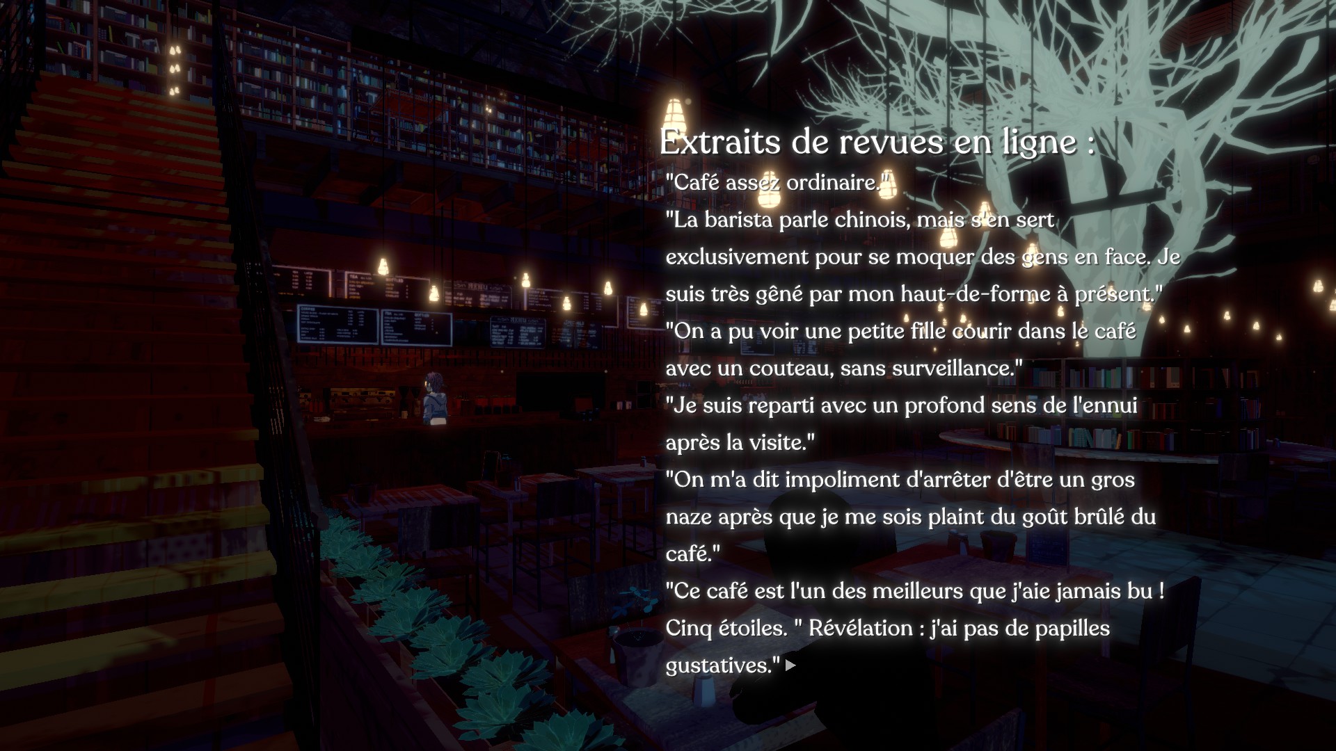L’histoire débute lorsque Kishan, un nouveau défunt, entre dans Le Terminal. C’est par sa propre découverte du café que nous apprenons les bases de l’univers, mais le joueur n’est qu’un spectateur de l’histoire que le studio a voulu raconter.
